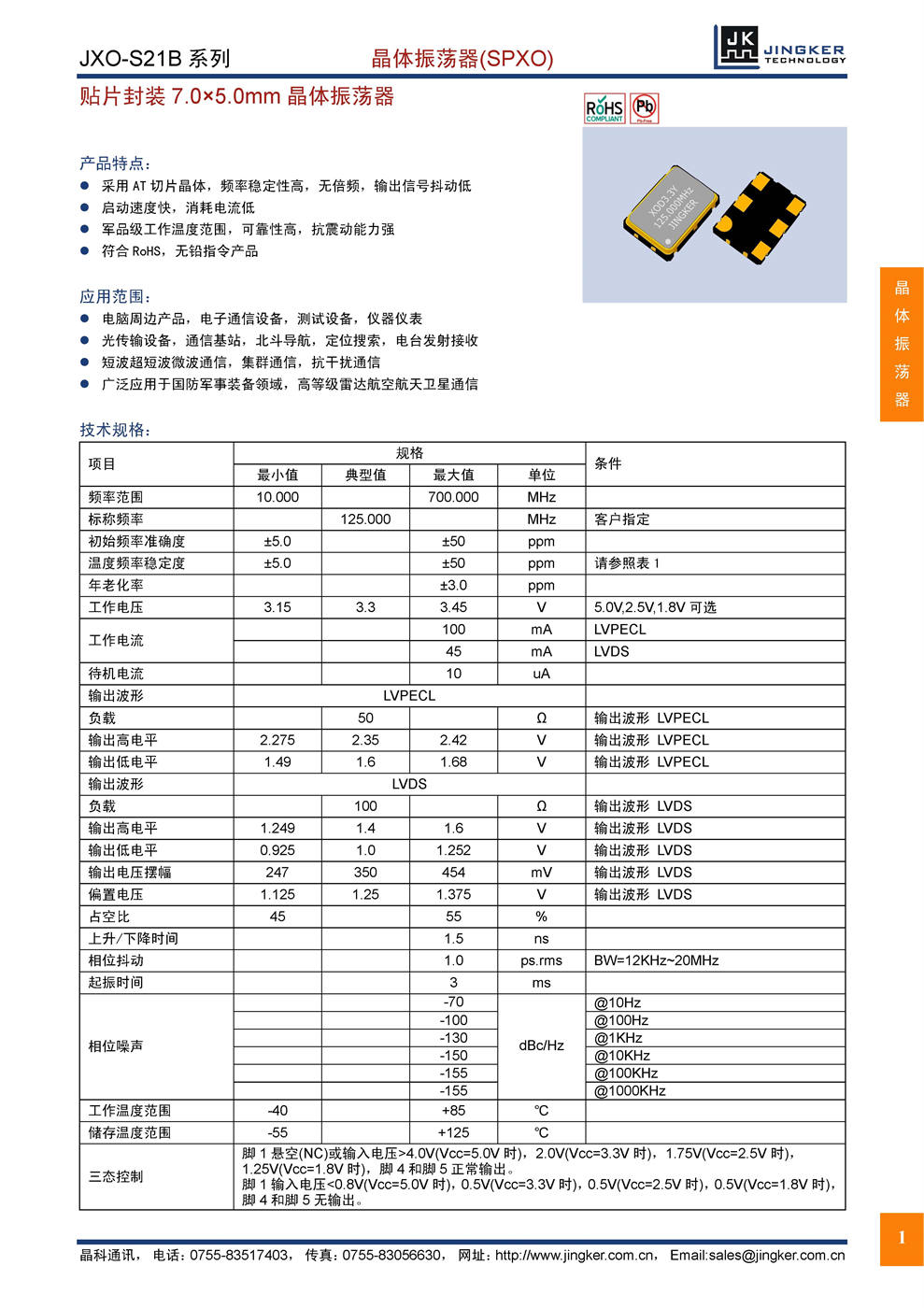產(chǎn)品特點(diǎn):AT切片晶體,無(wú)倍頻,低抖動(dòng);快速啟動(dòng),低消耗電流;軍品級(jí)工作溫度范圍,抗震動(dòng)能力強(qiáng);符合RoHS,無(wú)鉛指令產(chǎn)品。應(yīng)用范圍:電子通信,測(cè)試儀表;導(dǎo)航定位,電臺(tái)收發(fā);短波微波,集群通信;航空航天衛(wèi)星,軍用通信。